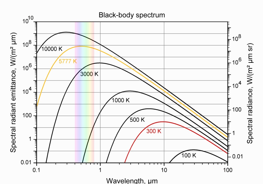 Förklaring av diagrammet: Skalorna är logaritmiska (ändras 10 gånger per huvudskalstreck) och temperaturen anges i Kelvin där 0 grader Celsius = 273,15K. Den stående regnbågen visar det synliga ljuset och kurvorna den strålning som en perfekt svartkropp avger vid olika temperaturer. Den gula kurvan motsvarar Solens yttemperatur (jo, den är faktiskt en bra svartkropp som vi kan se med blotta ögon!). Den röda (300K, ungefär 27 grader Celsius) är nära vår och Jordens temperatur.