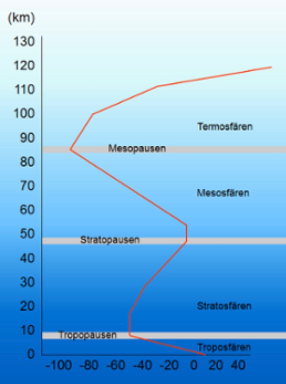 **) Troposfären och tropopausen är inte så väldefinierad som på bilden. Den beror på lufttrycket och då kall luft (typiskt närmare polartrakterna) har högre densitet så når man tropopausen där vid 6-10 km medan den i tropikerna kan vara på upp till 18 km höjd.