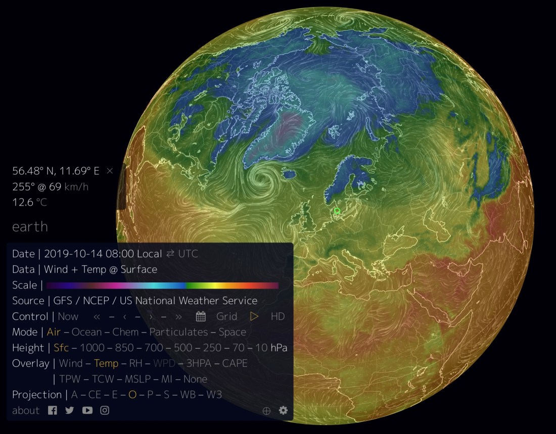 Något liknande sker redan i klimatsammanhang där data från ett stort antal satelliter sammanställs och du själv kan välja vad du är intresserad av. Klicka nere till vänster i startbilden så dyker en omfattande meny upp där du kan välja och kombinera parametrar. Du kan zooma och vrida globen samt välja tidpunkt. Klicka på platser så presenteras valda data och om du störs av den stora menyn, klicka på earth så krymper den ner till enbart datafältet.