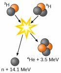 - Den frigjorda energin från fusionen (14.1 + 3.5 MeV / megaelektronvolt[2]) i form av fotoner (högfrekvent gammastrålning) vet vare sig upp eller ner. De som av slumpen (hälften?) rör sig mer mot centrum än utåt ökar tillsammans energidensiteten och därmed temperaturen i kärnan. De övriga glesar gradvis ut, knuffande avtar och temperaturen sjunker.