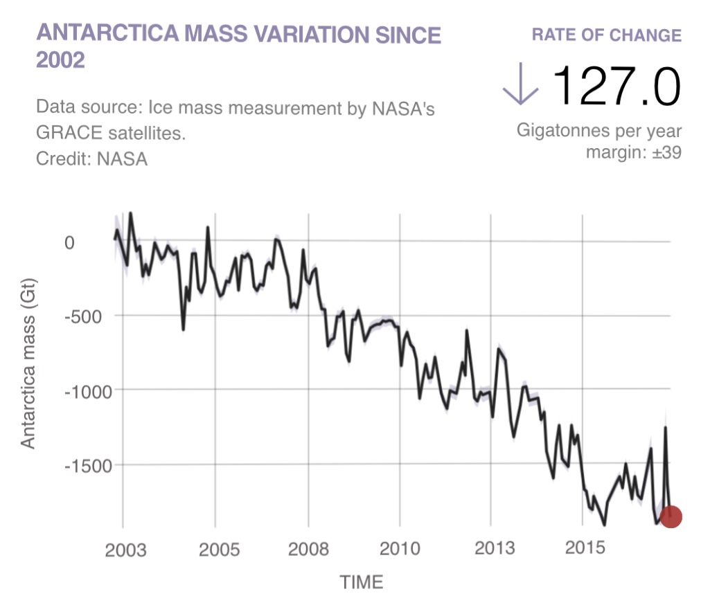 Källa: https://climate.nasa.gov/vital-signs/ice-sheets/ (Grafen om Grönland finns via länken.)