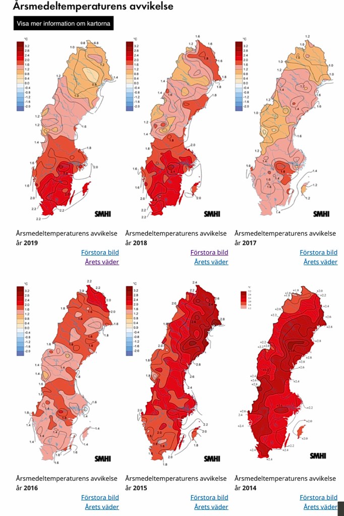 Bilden visar årliga medelavvikelser i temperatur för 2014 – 2019 På länken under finns data för 2020 (hittills) samt länk till övriga kartor från och med 2000. Ett enda år, 2010, har visat minusanomali.