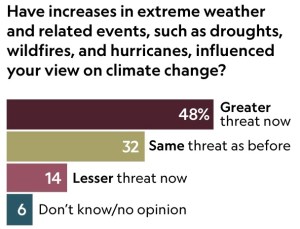 A majority of the youngest and the oldest groups of Americans polled (51 percent of those 18-34 years old and 52 percent of those 65 or over) say the extreme conditions have made them think climate change has become a bigger threat. Overall, 48 percent of Americans agree, and 32 percent say it is the same level it has always been.