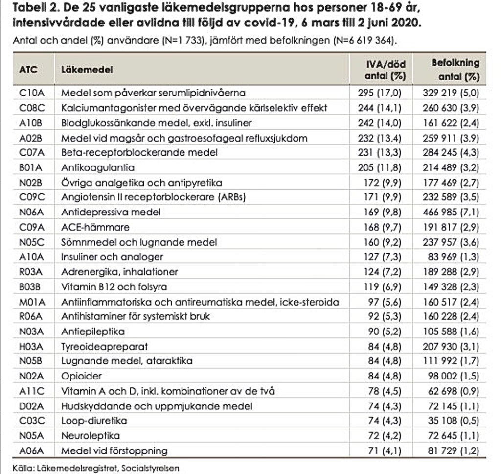 Vissa mediciner är vanliga bland de som har svår covid-19 och eventuellt dör. Märk hur den intervjuade i videon slingrar sig och ogärna vill gå in på vilka de är. På direkt fråga exemplifierar han med loop-diuretika (vätskedrivande), som förekommer i 4.3 % av fallen. Men den ligger först på plats 23!.