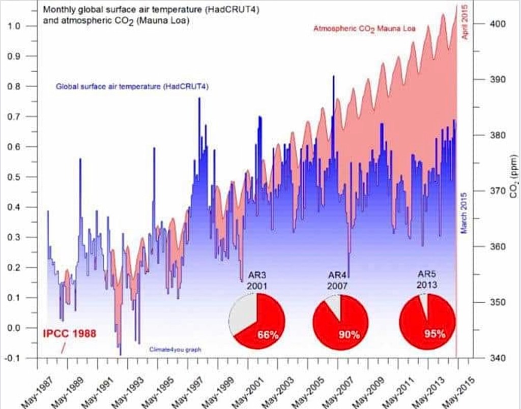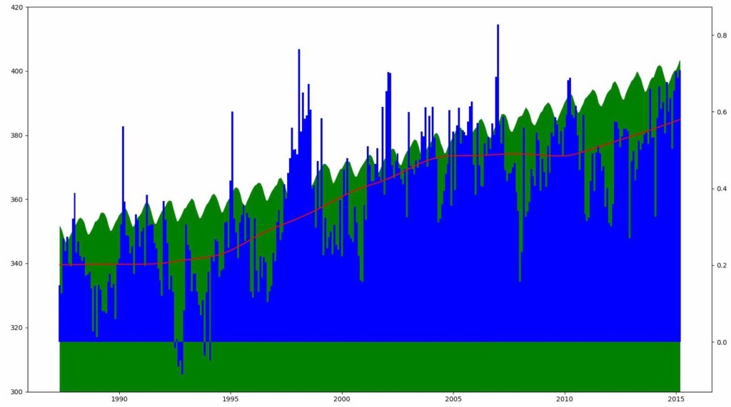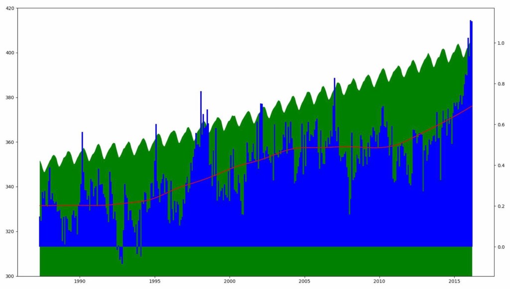 Atmosfärens andel av koldioxid och avvikelser av Jordens marktemperatur (blått) kombinerat i samma graf. (1988 – 2015)