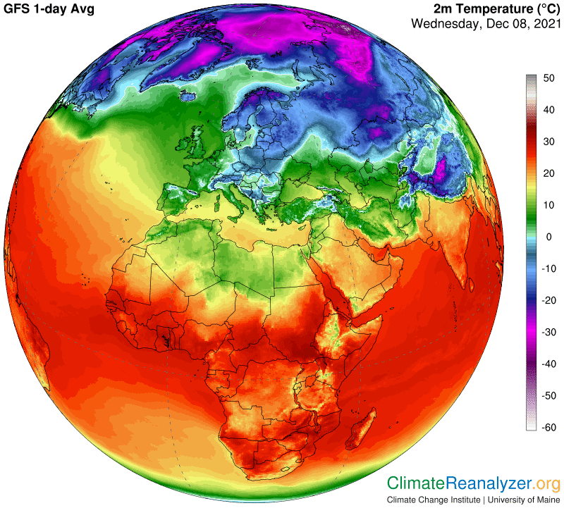 Bilden visar avvikelser i temperatur på 2 meters höjd, blå fält är kallare än normalt, röda är varmare. Norden och de Baltiska länderna är rejält kallare just nu medan Grönland och norra Canada är betydligt varmare. Arktis är 1,1 °C varmare och Jorden som helhet 0,4 °C varmare än normalt. Det matchar tumregeln att polartrakterna värms tre (3) gånger mer.